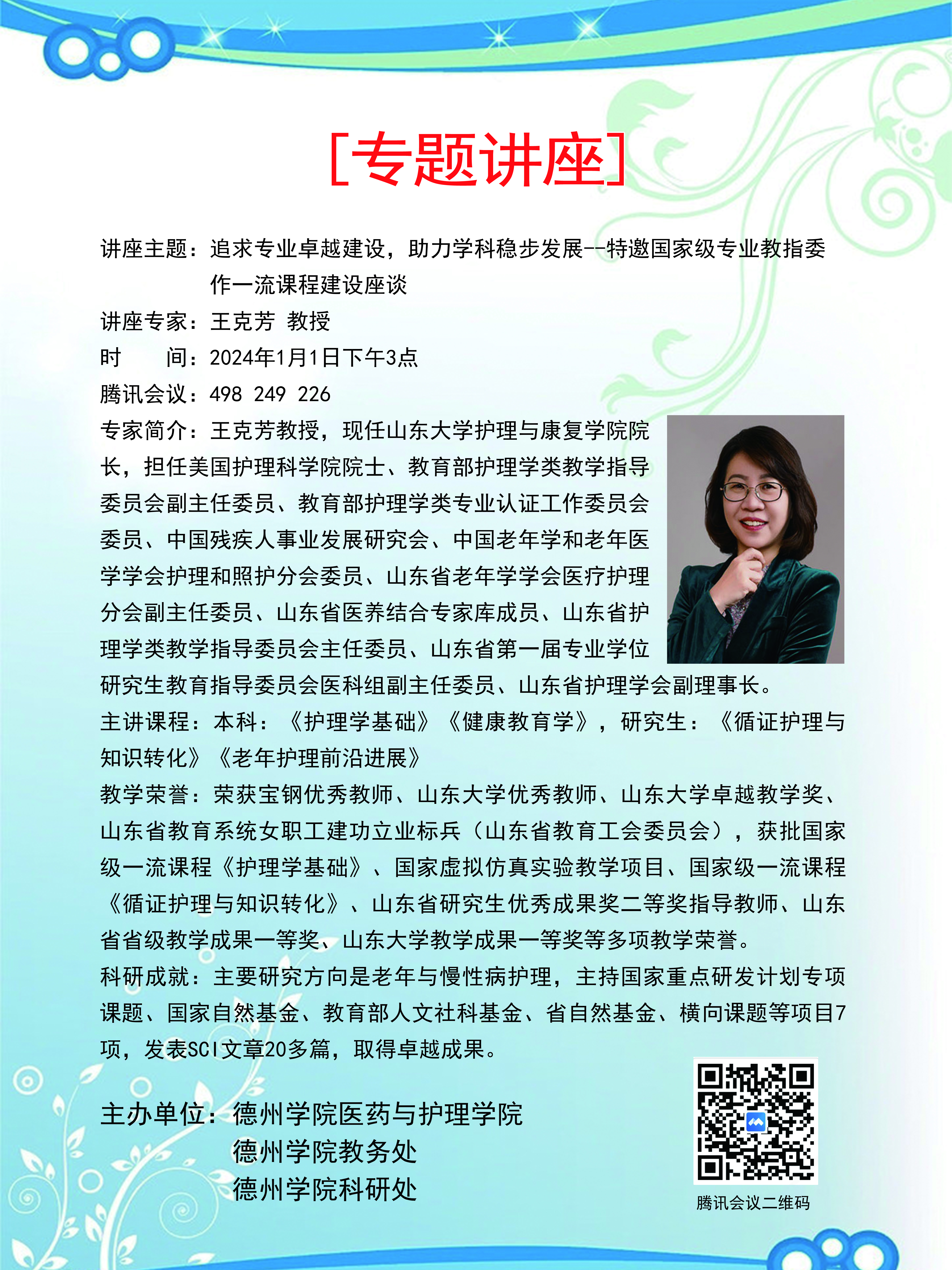 为进一步做好课程建设及教学改革工作,提高护理教育教学质量,2024年1月1日下午,应德州学院医药与护理学院邀请,山东大学护理与康复学院院长王克芳教授通过线上的方式,以“强化教学改革、建设优质课程”为主题,从教学改革的来源和去向、教学创新点的实施与评价、课程建设的思路等方面进行报告,并与参会教师进行充分的交流与讨论。医药与护理学院教学工作负责人、护理系教师参加。