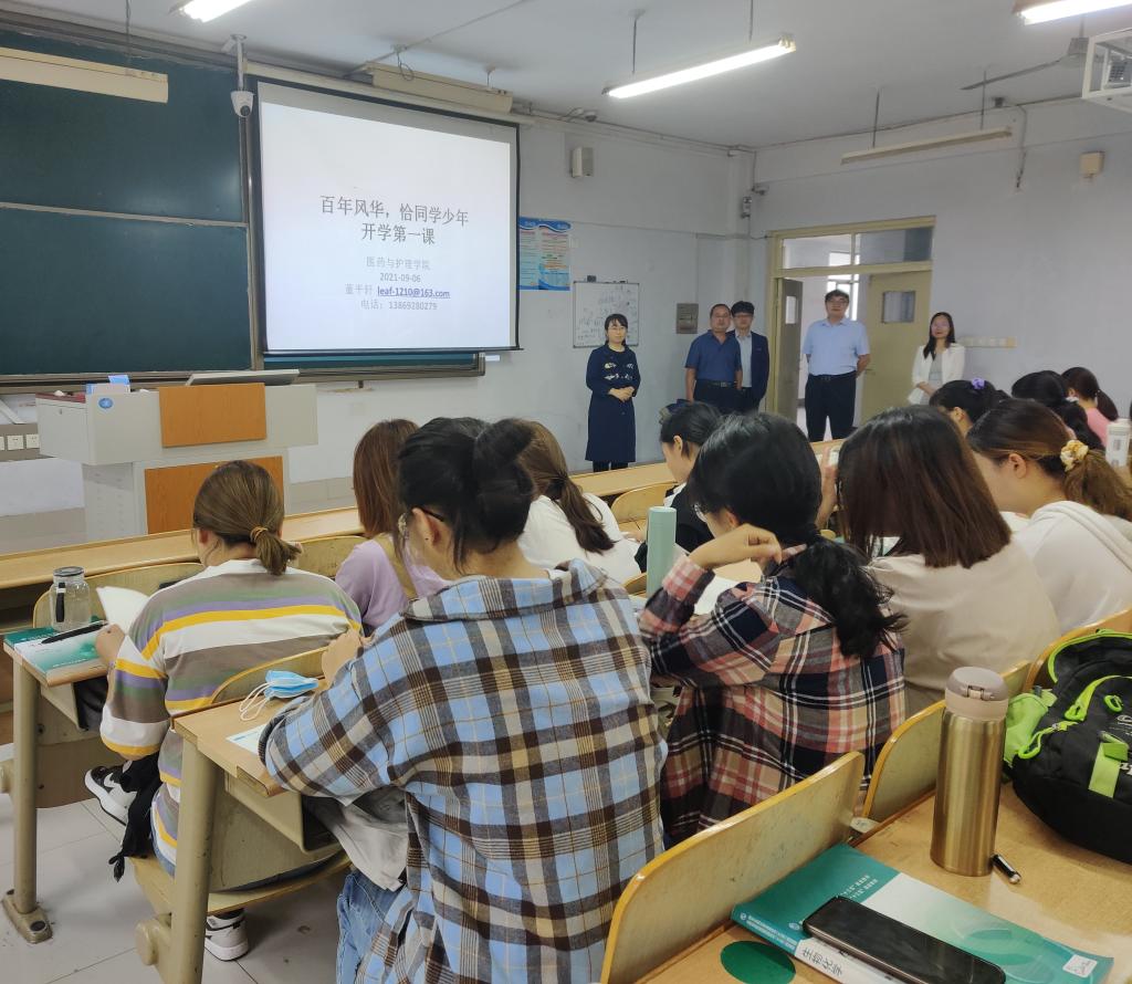 在校生开学首日全校统一开展“开学第一课:百年风华.恰同学少年”主题教育加强在学生返校复学后思政教育、安全教育心理健康教育和科学防疫指导医药与护理学院任课教师以视频内容为切入点积极融入课程思政元素,引导学生围绕“新时代青年学生的责任和担当是什么?新学期的打算和学习目标?如何成长为高素质应用型人才?谈体会,谈感受,培养学生的爱党爱国情怀,提高学习意识