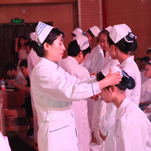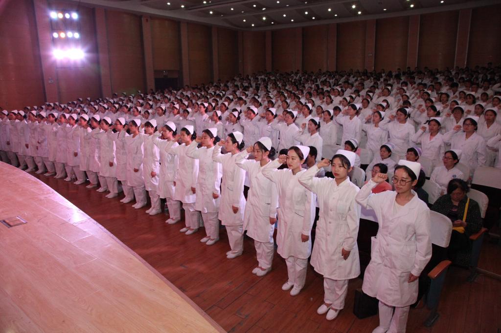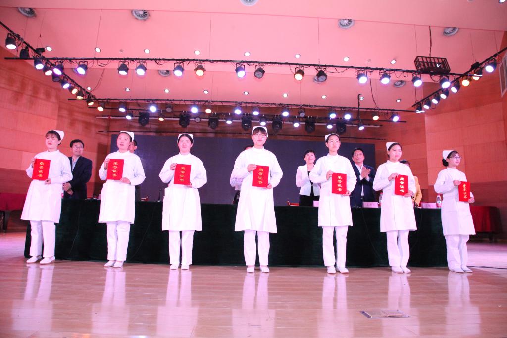 德州市人民医院护理部主任王泉莉、德州市第二人民医院护理部主任刘桂芝、德州市妇幼保健院护理部主任高丽芹,我校医药与护理学院护理系邱桂红、任吉、于雯老师为护理专业学生代表授护士帽,全体学生在老师的带领下,庄严宣誓,表达为祖国医药护理事业奉献终身的信念。