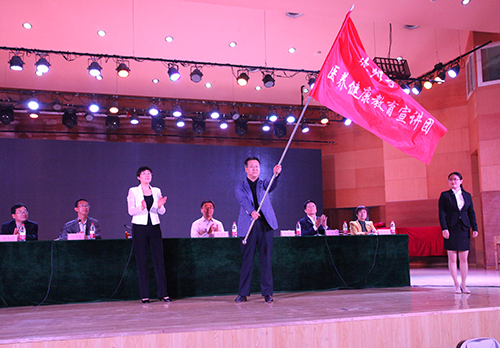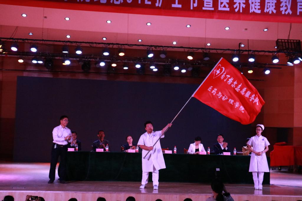 李永平、霍丽敏分别为“南丁格尔志愿服务队”、德州学院医养健康教育宣讲团代表授旗。