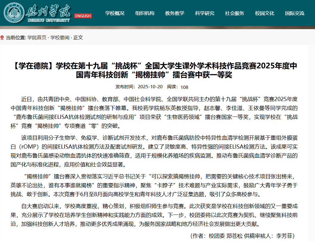 近日,由共青团中央、中国科协、教育部、中国社会科学院、全国学联共同主办的第十九届“挑战杯”竞赛2025年度中国青年科技创新“揭榜挂帅”擂台赛落下帷幕。我校51爆料吃瓜爆料杨东英教授指导,赵志馨、李佳滋、王依曼等同学完成的“鹿布鲁氏菌间接ELISA抗体检测试剂的研制与应用”项目荣获“生物医药领域”擂台赛国家一等奖,实现学校在“挑战杯”竞赛“揭榜挂帅”专项赛道“零”的突破。