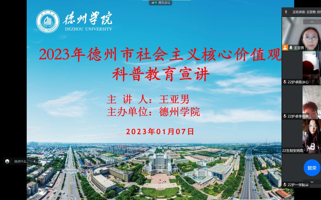 近日,为践行社会主义核心价值观,提升大学生综合素质树立大学服务社会的良好形象助力德州争创全国文明城市更多人感受科普魅力德州学院医药与护理学院组织德州市2023年社会主义核心价值观科普教育主题宣讲活动,医药与护理学院护理系王亚男老师主讲,医药与护理学院400名大学生参加了活动。