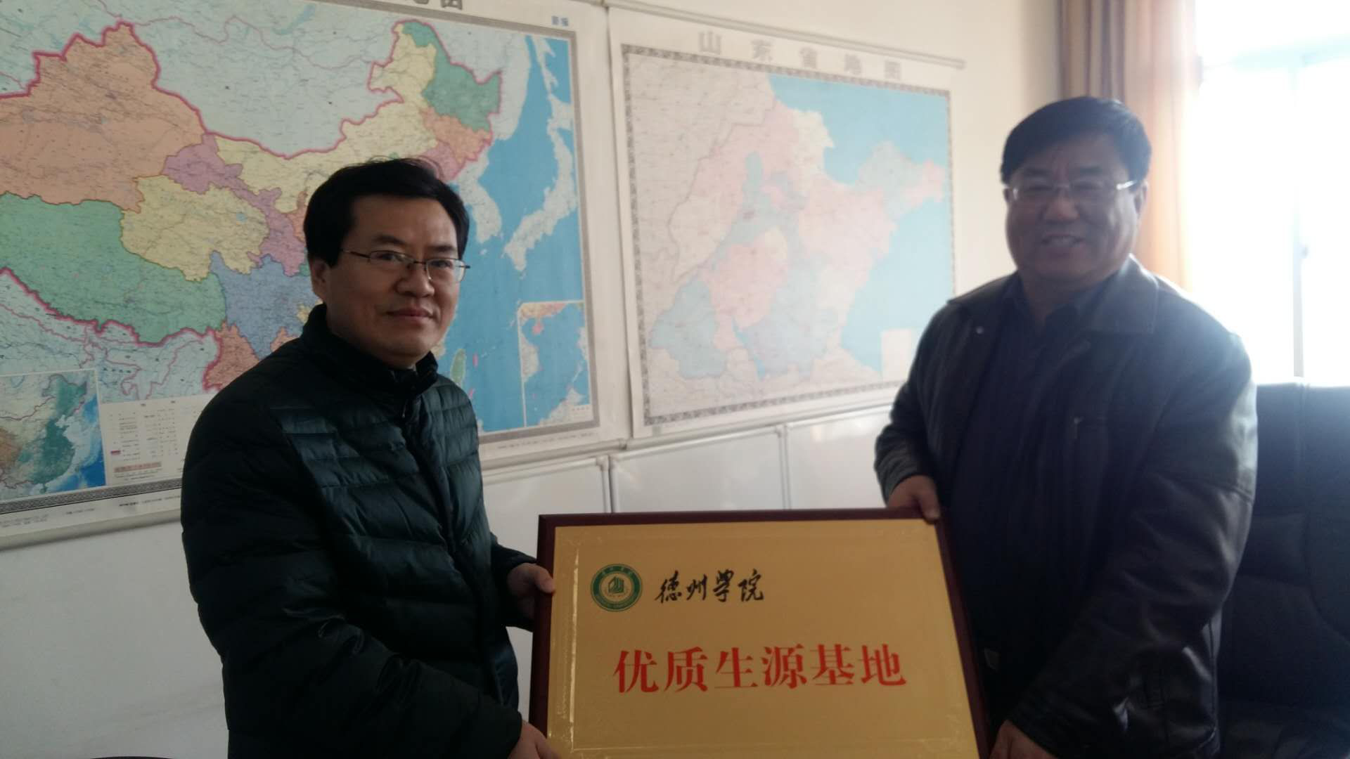 2018年12月18日,受学校和招生就业处委托,医药与护理学院副院长孙士杰老师、办公室刘云利老师等一行两人赴德州市陵城区第一中学,双方就“德州学院优质生源基地”建设达成了合作协议并进行了授牌。陵城区一中校长陈永利、副校长陶俊贵出席了签字和授牌仪式。