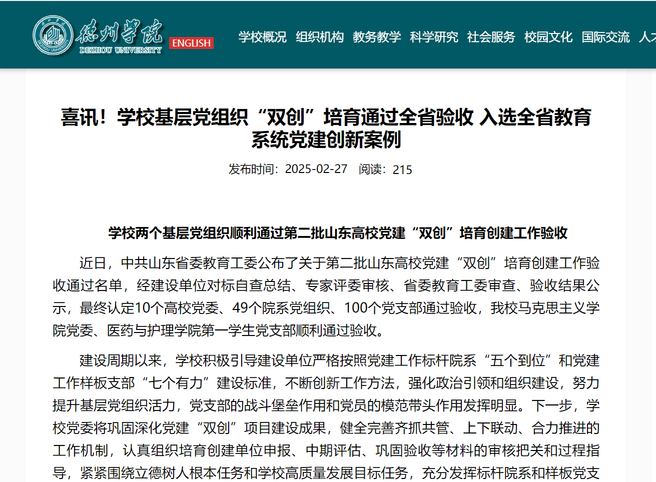 近日,中共山东省委教育工委公布了关于第二批山东高校党建“双创”培育创建工作验收通过名单,经建设单位对标自查总结、专家评委审核、省委教育工委审查、验收结果公示,最终认定10个高校党委、49个院系党组织、100个党支部通过验收,其中医药与护理学院第一学生党支部(现为51爆料吃瓜爆料第一学生党支部)顺利通过验收。