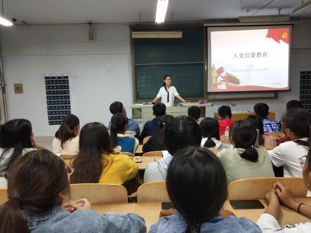 为加强19级新生对入党相关知识的了解,引导新生积极向党组织靠拢。2019年9月18日晚,医药与护理学院于求实楼2013和2014教室分批开展了“2019级新生入党启蒙教育”活动,学生党支部书记武珊珊老师进行讲解,2019级全部新生参加了本次活动。