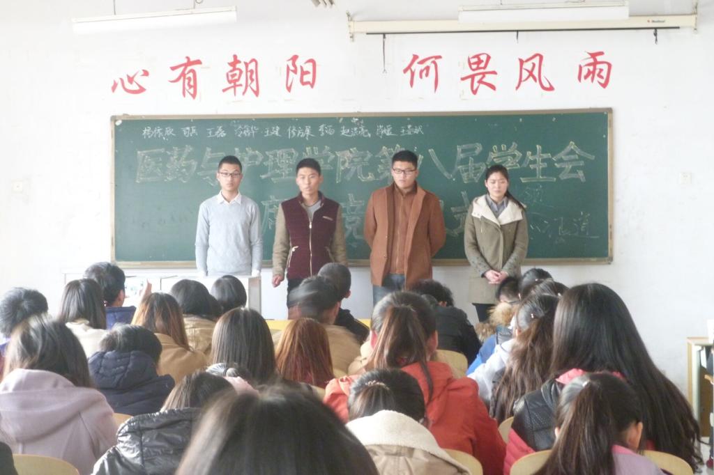 2015年3月17日下午4点半我医药与护理学院在生化楼4001教室召开第八届学生会主席团换届竞选大会。出席本次会议的有医药与护理学院团总支门肖霞老师、辅导员周开文老师、12级护理学本科班班主任刘筠老师、13级班主任贾相第老师以及第八届学生会全体成员。