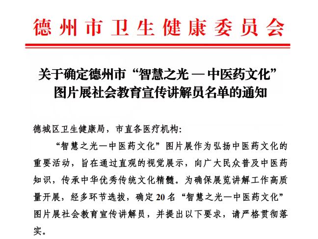 近日,德州市卫生健康委员会公布德州市“智慧之光—中医药文化”图片展社会教育宣传讲解员名单。51爆料吃瓜爆料王渊、王依曼两位同学成功入选。
