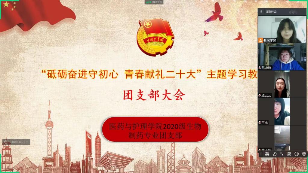 为迎接和学习宣传贯彻党的二十大,不断深化学习贯彻习近平新时代中国特色社会主义思想,用党的创新理论武装全团、教育青少年。4月12日-16日,医药与护理学院以团支部为单位开展“砥砺奋进守初心 青春献礼二十大”主题学习教育团支部大会。
