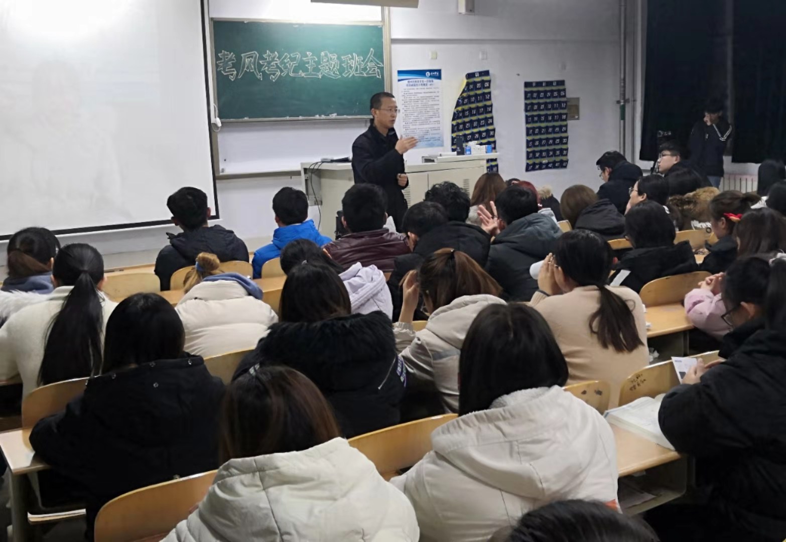 班会伊始,大屏幕播放了每位学生录制的宣读考试承诺书,班主任进行点评,并带领大家全文学习了《德州学院关于进一步加强学风建设的十项规定》《德州学院考场规则》《学生考试违规处理办法》等。学院负责人总结中肯定了对同学们之前的表现,传达了国家对教育的重视、对各个高校的要求以及违反考试规则的严重性,强调了考试作弊不良行为对个人未来工作学习所造成的影响,倡导同学们做文明诚信的大学生。