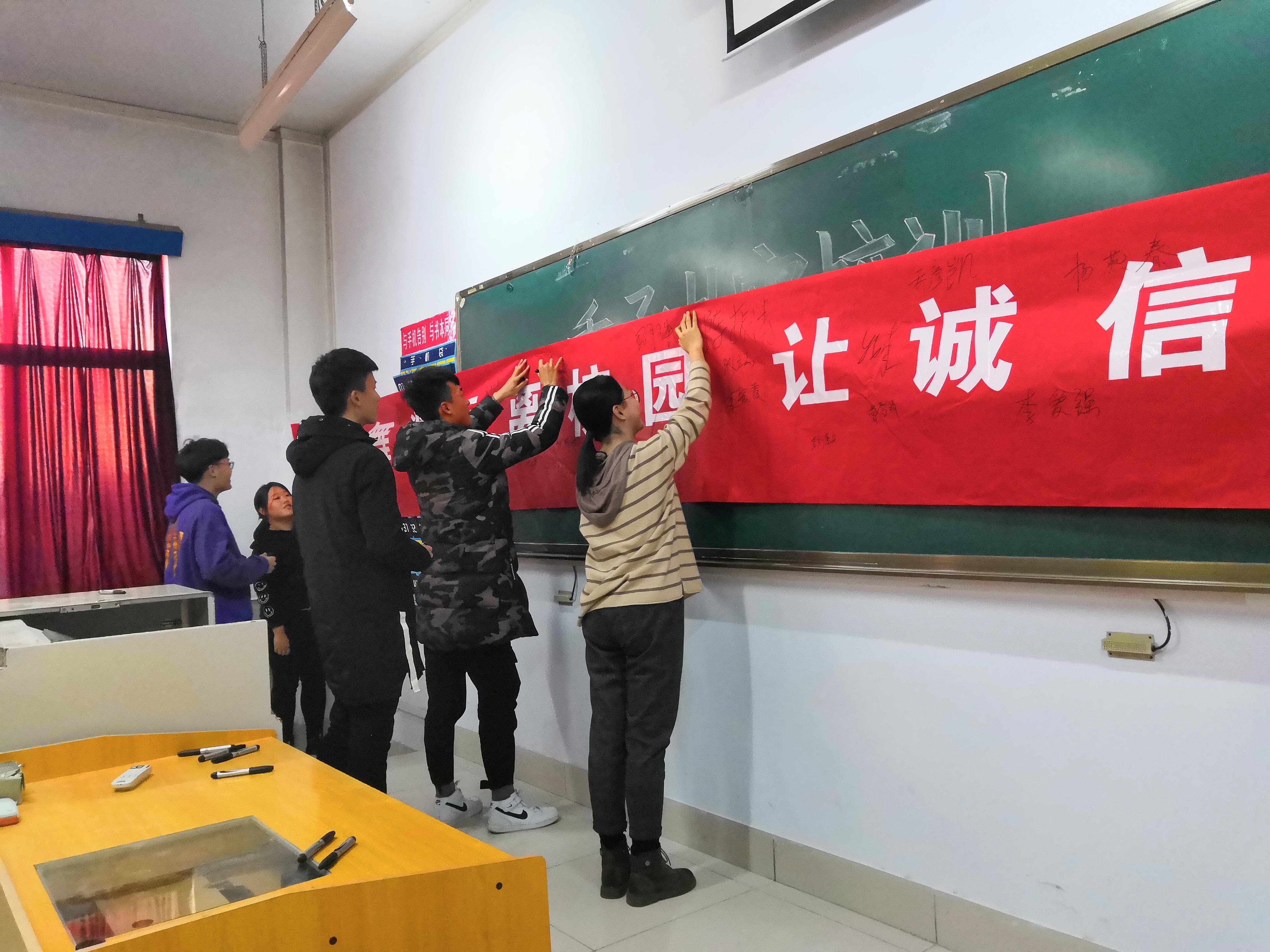 活动中,孟书记结合以往作弊同学事例进行了考试考风考纪教育,希望同学们在考试中能端正态度,严肃考风考纪,诚信参加考试。随后,武珊珊老师带领同学们一起学习了考试注意事项及考试作弊处罚条例,为考生打好了预防针。之后,学习督察部成员带领全体学生进行考前宣誓,保证自己一定会诚信参加考试,绝不作弊。活动最后,与会成员在诚信考试横幅标语上进行签字仪式