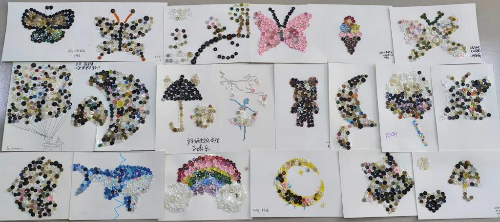 学院准备了色彩斑斓的纽扣,瞬间激发了参与者的创作热情。活动过程中,大家围坐在一起,认真绘制设计草图,精心挑选合适的纽扣,再小心翼翼地进行粘贴。有人专注于细节,为每颗纽扣寻找最佳位置;有人热烈讨论,分享快乐、增进友谊,在交流中碰撞出灵感火花。同学们通过专注于纽扣创作,忘却外界压力,获得内心的平静与满足,对心理健康起到积极的调节作用。经过同学们的创作,一件件精美的作品诞生了。