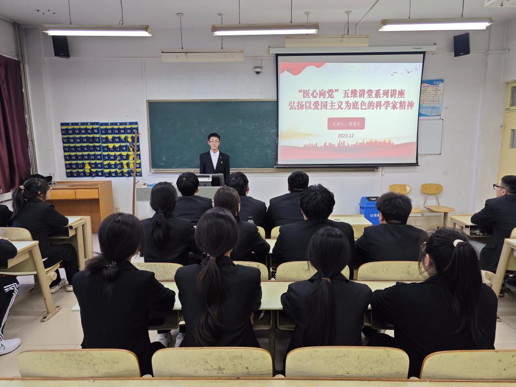 为贯彻落实习近平总书记关于科技创新的重要论述,增强民族凝聚力和自豪感,2023年12月12日,医药与护理学院开展“医心向党”五维讲堂系列讲座之弘扬以爱国主义为底色的科学家精神的专题讲座。学生党员代表周建东同志主讲,第一学生党支部全体党员参加。