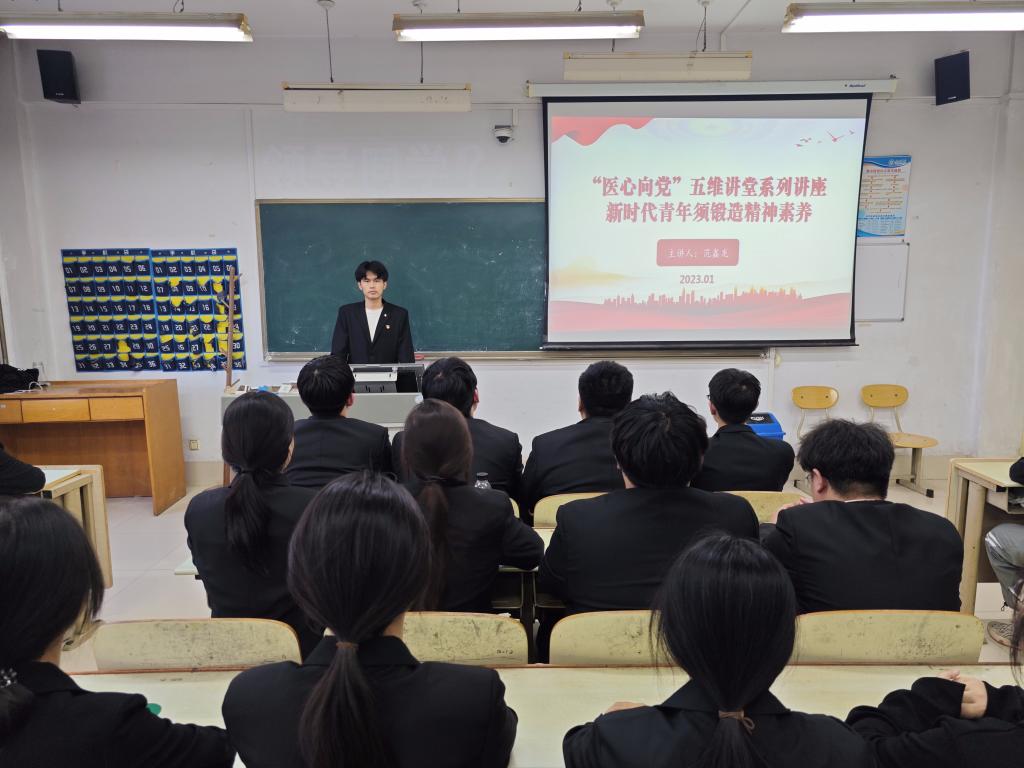 为引导青年学子树立正确的人生观、价值观,提升新青年精神文明风貌,医药与护理学院于2023年1月3日开展“医心向党”五维讲堂系列讲座之新时代青年须锻造精神素养主题讲座,讲座由学生党员代表范鑫龙主讲,第一学生党支部全体党员参加。